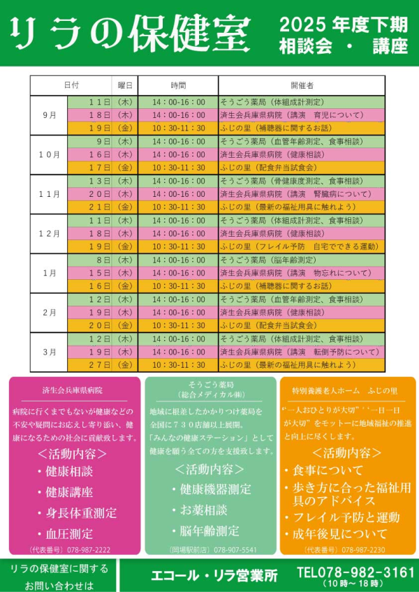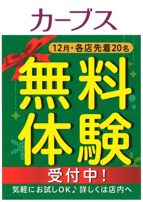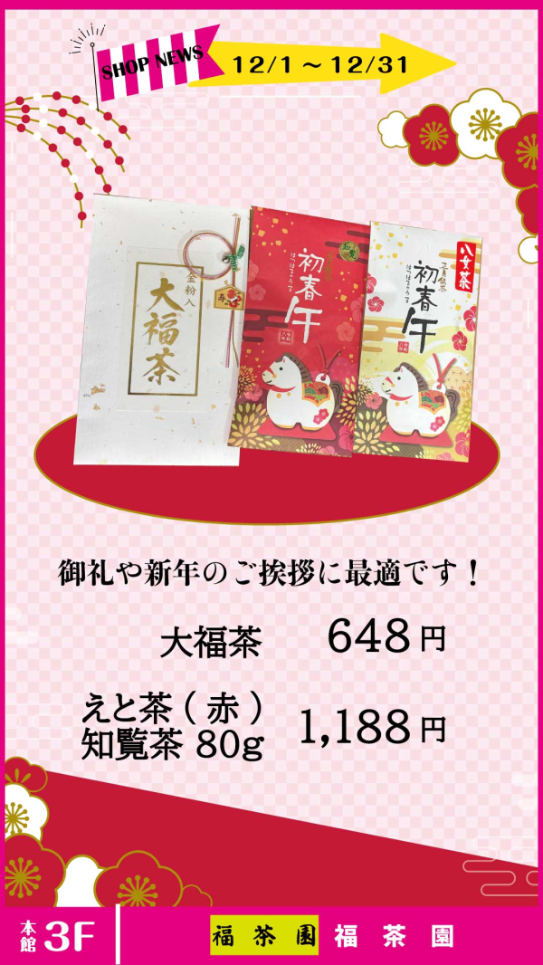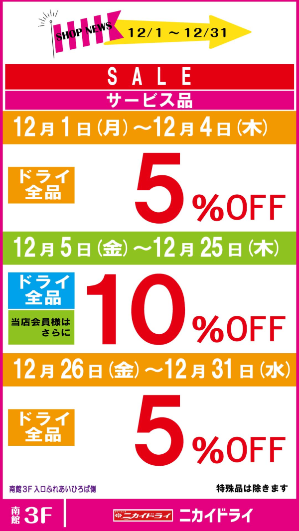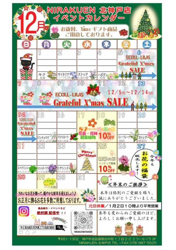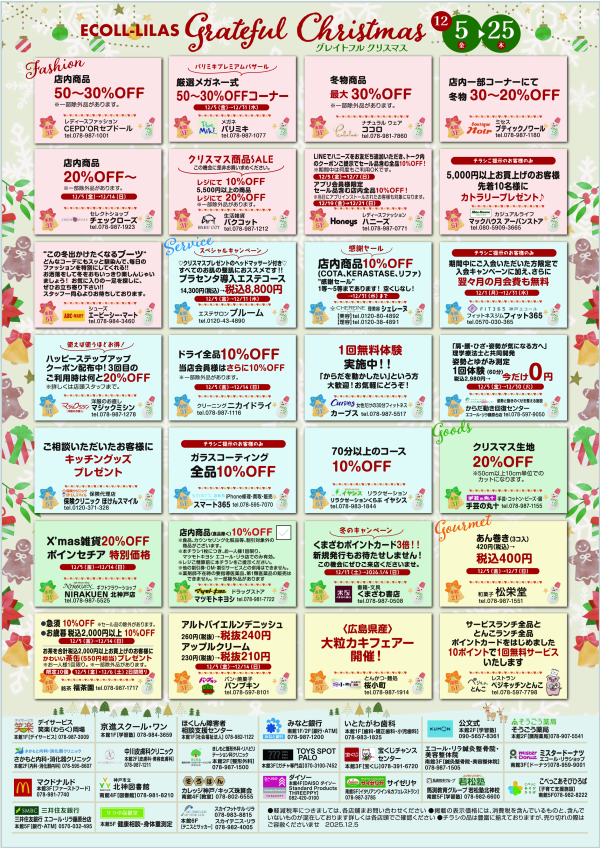 すでに配布しておりますキャンペーンチラシにおいて、一部店舗の特典・割引期間の記載に誤りがあることが判明いたしました。 エコール・リラ側の不備によるものです。 <正しい割引期間> ●店舗名:パンプキン:12/5(金)~12/14(日) ●店舗名:福茶園:12/5(金)~12/14(日) ※ただし茶缶プレゼントは表記通り ご迷惑と混乱を招き申し訳ございません。